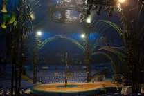 El centro del escenario en Amaluna tiene un mecanismo que le permite girar, al igual que el carrusel suspendido sobre el escenario. La escenografía tiene muy pocas partes móviles. Esto permite una mayor atención a los artistas.